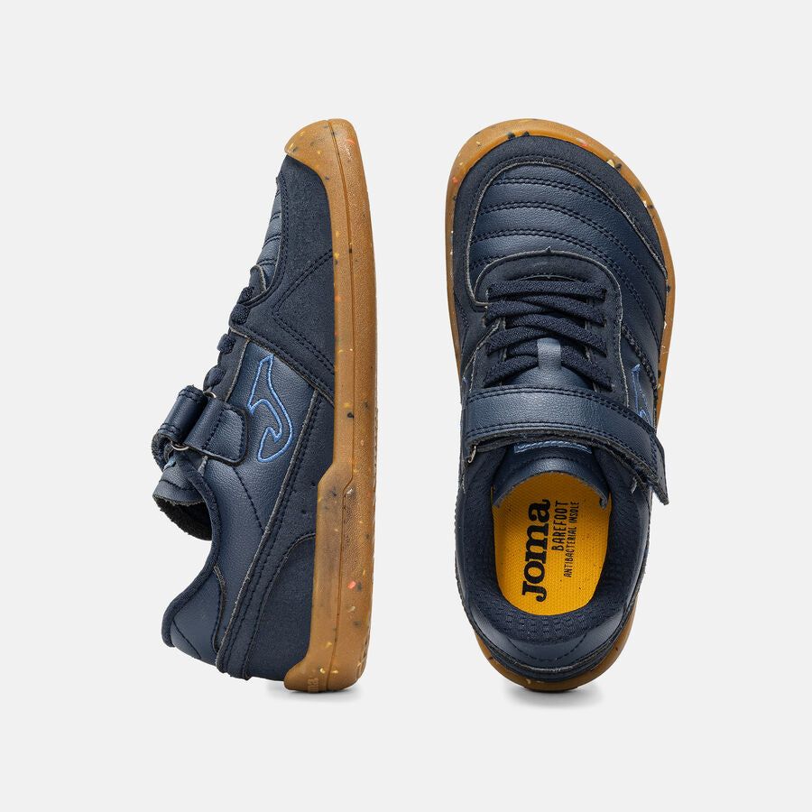 Zapatillas barefoot infantiles 100% recicladas, con upper de piel reciclada, suela Joma Barefoot de caucho reciclado, puntera ancha y Zero Drop. Flexibles, sostenibles y diseñadas para favorecer un desarrollo natural y saludable del pie.